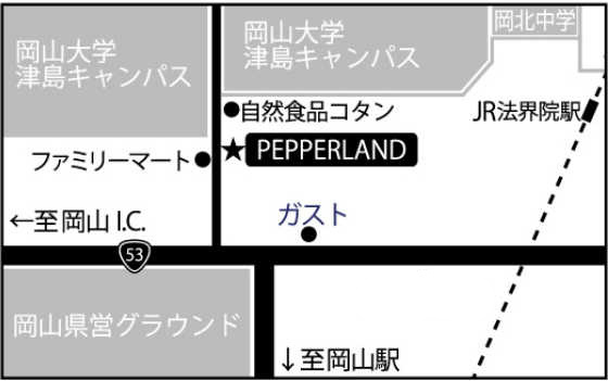 タクシー : JR岡山駅西口の出口に出ていただいて、エスカレーター下にあるタクシー乗り場から、学南町・岡山大学筋通りのファミリーマート岡大店前のペパーランドまで。(約1000円)